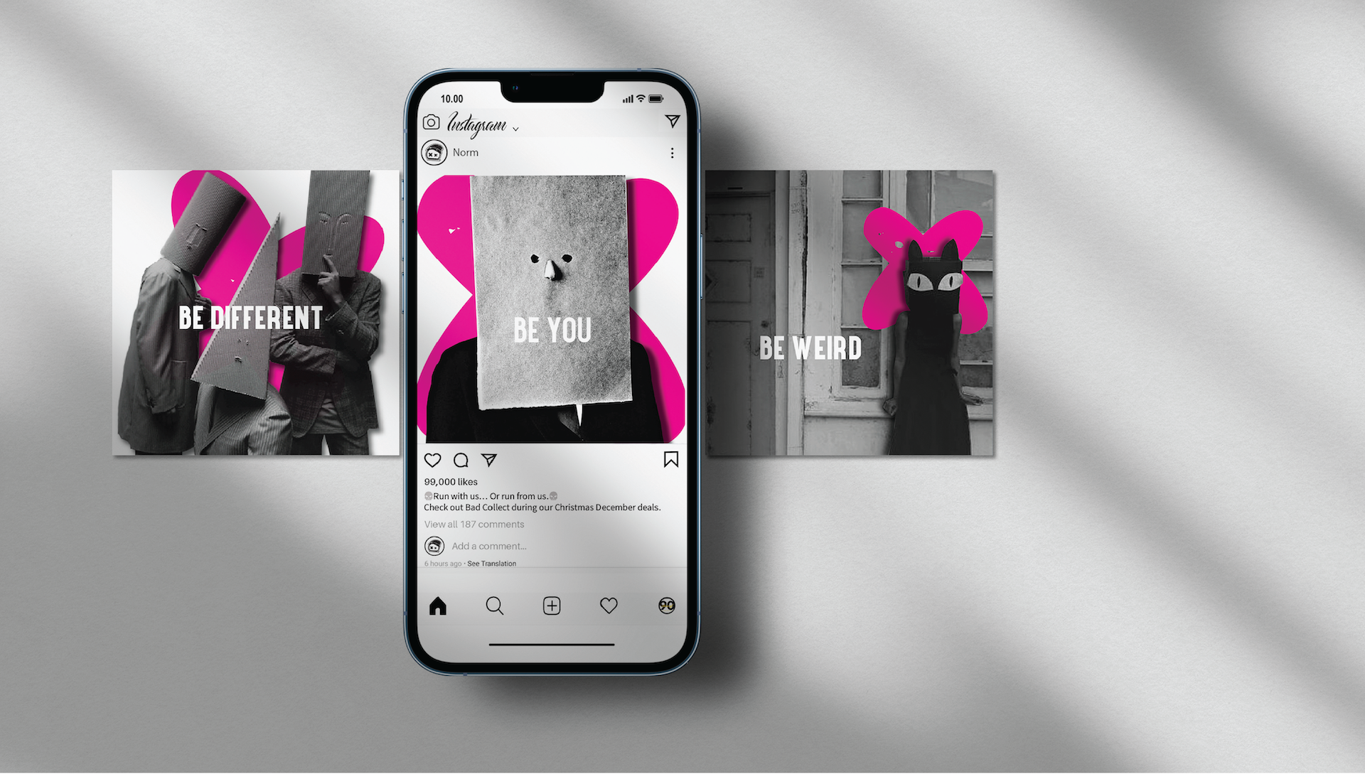 This Instagram campaign focuses on identity and self-expression through a bold, repeatable message: “BE DIFFERENT,” “BE YOU,” and “BE WEIRD.” Each visual features obscured or altered faces using unconventional materials, reinforcing the rejection of societal labels.