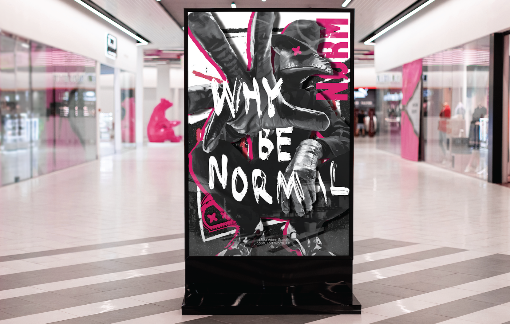 The “WHY BE NORMAL” poster acts as a visual manifesto for the brand. A chaotic composition layered with hidden elements invites viewers to engage more deeply, rewarding closer inspection with embedded brand details such as the logo and letterforms.
